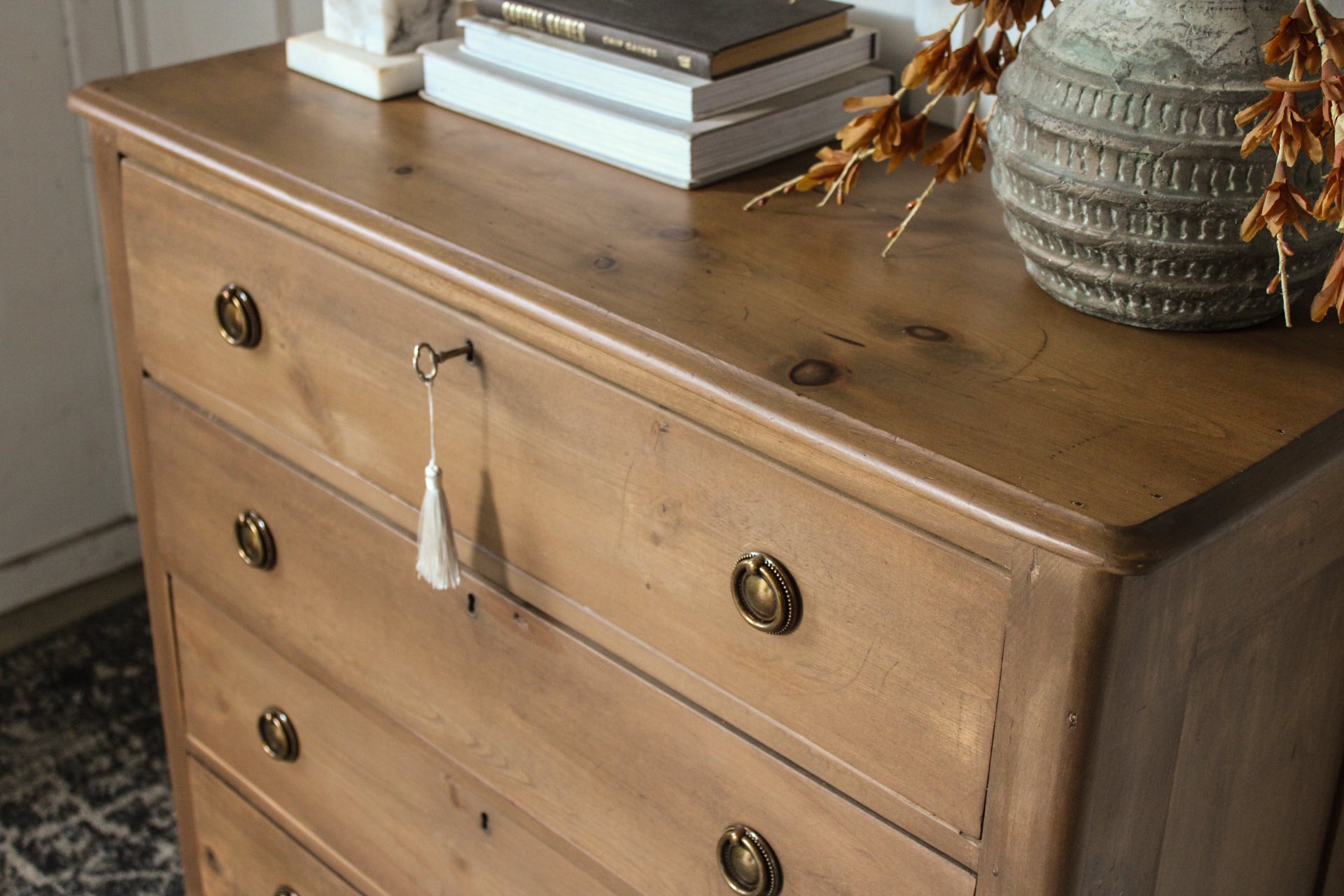 We just gave this stunning 19th-century chest a full refinish, and it's turned out beautifully! What I love most about its design is its simplicity - a refreshing change from the often ornate pieces of that era. Constructed from solid pine, it features 4 dovetailed drawers in perfect working condition. This piece can seamlessly fit into various home styles. We've stained it in General Finishes Antique Oak and sealed it with a matte top coat.