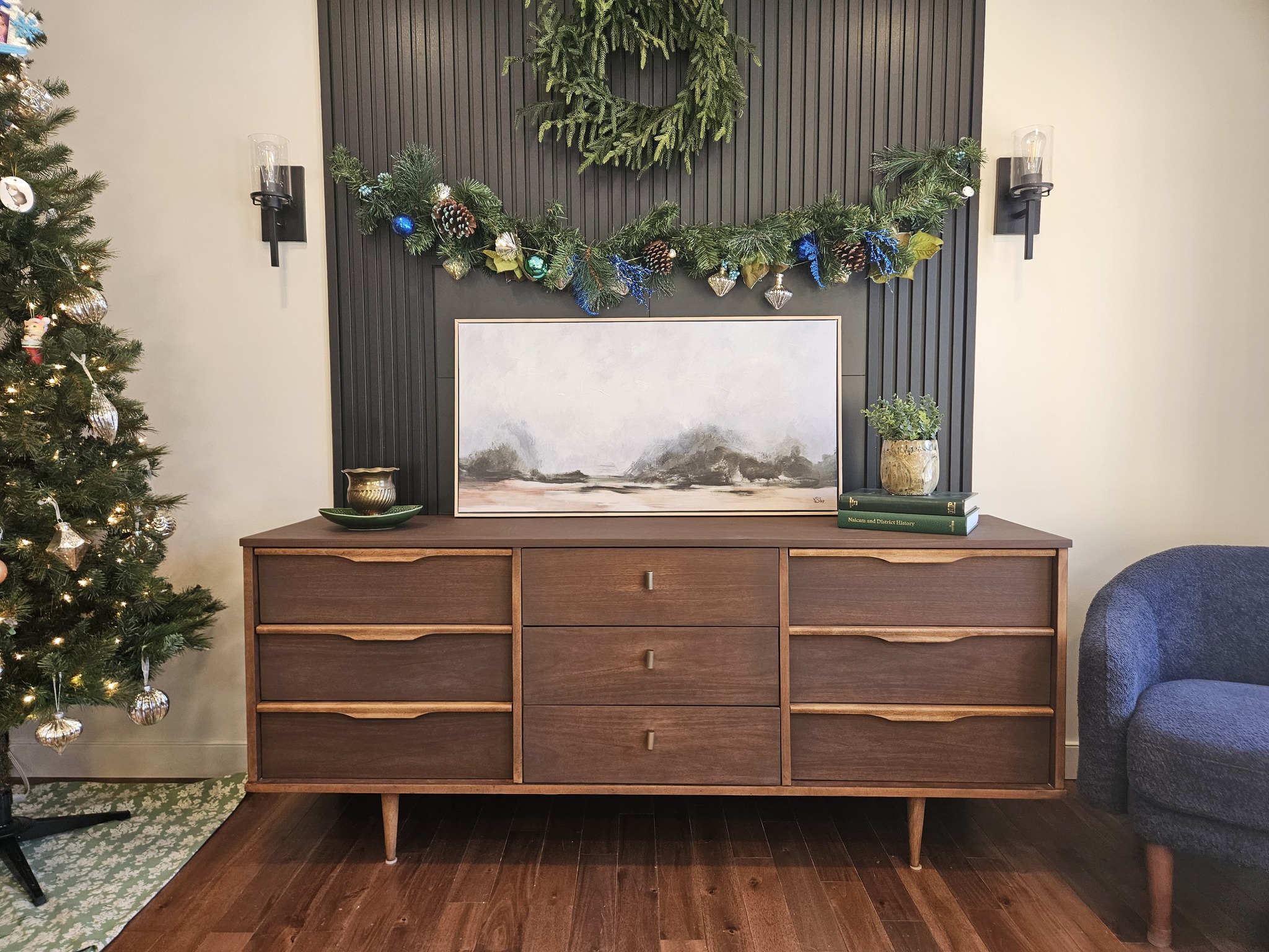 Vintage mid-century modern wood dresser refinished with General Finishes Antique Walnut Gel Stain and topcoated for protection with a matte finish.