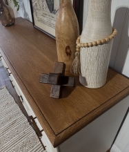 Lots of dry wood, loose veneer and years of barn dust. Completely stripped and refinished in General Finishes WB Tobacco then sealed with a satin lacquer.