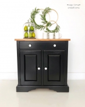 "Coffee Bar/ Small Buffet- this oak cabinet has been painted in General Finishes Lamp Black while the top was stained in maple for a beautiful contrast and the perfect farmhouse look. The entire piece was sealed with an oil based polyurethane for...