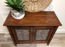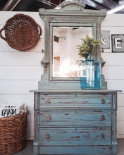 "We also finished another one of these vintage cabinets with mirrors. Perfect for an entryway piece or a vanity, etc. The mirror does have age spots. This one is painted in a distressed General Finishes Persian Blue. Finished in a dark wax." - Odds...