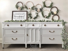 "I don’t know if I’m more thrilled with the transformation or finally being done! Nine drawers are no fun! No fun at all! Finished in a subtle two tone finish, General Finishes Snow White & Seagull Gray, smooth & durable polyurethane finish...