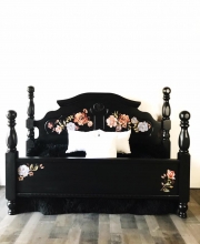 Stunning floral bed frame in General Finishes Lamp Black Milk Paint by New Old Finds.