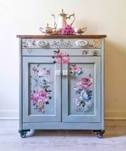This Jacobean vanity has been painted in a mix of Coral Crush and Snow White. The details were painted with Seagull Gray and Argentine Pearl Effects and then completely glazed with Winter White Glaze Effects.