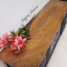 "This was stained with General Finishes American Walnut then got a light coat of Black Gel Stain- I say light because I was impatient and didn't wait the recommended time & my first coat of Arm-R-Seal took quite a bit of the black off. The tops...