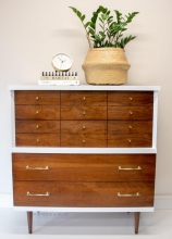 "Mid century pieces just make my heart swoon! Crisp, clean and modern with a nice contrast between bright white and dark wood. General Finishes Snow White and Java Gel Stain make for a gorgeous combination. Vintage brass hardware, original to the...