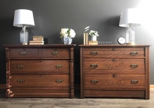"These incredible Eastlake Chests were refinished using General Finishes Antique Walnut Gel Stain with a wax-like finish. Now they make the perfect oversized nightstands." - ReFind Design by Coco Clare