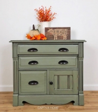 "This beauty was refreshed with General Finishes Milk Paint in Basil, lightly distressed then glazed with a custom mix of GF glazes. New hardware by D. Lawless Hardware finished off the transformation! I’m considering calling this glaze mix “Black...
