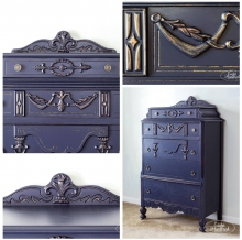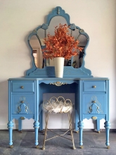 General Finishes “Halcyon Blue” milk paint with HPTC in Satin. Gilders Paste Wax in Pure Gold. I also used a fine gold paint pen on the drawer fronts and on the bottom of the mirror.