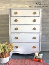 "Vintage 4 drawer dresser hand painted in General Finishes Milk Paint Queenstown Gray with stained top. Original hardware painted black. Lightly distressed and sealed with GF top coat." - The Painted Mermaid
