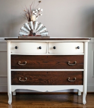 "This gentlemen right here is sporting General Finishes Driftwood on the body and Lamp Black on the original wood hardware. It has 8 big strong dovetailed drawers with the fronts stained in Weathered Oak and the insides lined with weathered wood...