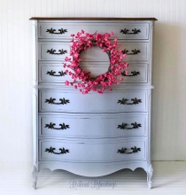 "This fabulous cherry dresser is oh so elegant! Professionally painted in General Finishes Seagull Gray and lightly distressed to show the beautiful curves. The top was sanded and stained in General Finishes Gel Stains in Java. Five large dovetailed...