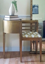 "Vintage mahogany gossip bench painted in General Finishes Burnished Pearl, an antique gold, and sealed with black wax. The seat is reupholstered with designer fabric from the Genevieve Gorder Collection." - GarageMama Vintage