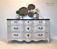 "French farmhouse perfection! This solid wood French provincial dresser/ buffet from Huntley Furniture Co. is simply stunning with all her curves.The top has been stained in a distressed espresso while the bottom was painted in layers. Using General...
