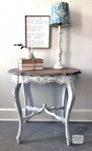 "The carved details on this Antique table are over the top! The base was painted in General Finishes Antique White and distressed to bring out all the beautiful details. Smooth and durable polyurethane finish applied. The perfect size for an entry,...