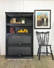 "Refinished lawyers bookcase up for sale. This is a solid wood, 4 door piece that will hold your books or Knickknacks. Each door folds back inside the piece. It has been refinished in General Finishes lamp black and sealed to protect. New screen has...