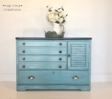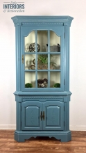 "I love corner cabinets!! They are so practical and fit in their space just perfectly. This piece could work in any room of the house as an accent piece, china storage, or linen cabinet! We refinished this one in a combination of Charleton Blue...