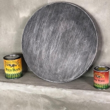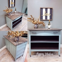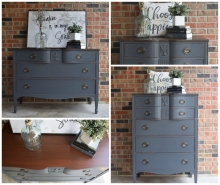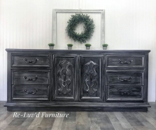 "This has been refinished in General Finishes Driftwood Milk Paint, glazed with their Pitch Black Glaze, and sealed in their High Performance Topcoat. Silver gilding wax has also been added to the edges for an extra pop." - Re-Luv'd Furniture...