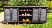 "How beautiful is this entertainment center? The top of this piece has been planked, stained, and sealed to protect. The body has been refinished in General Finishes Gray Gel Stain and glazed in their Pitch Black Glaze then sealed with their High...