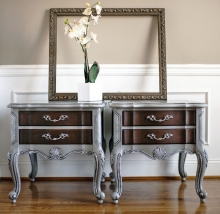 "Stunning French Provincial Hammary Side Tables. Beautifully Hand Painted in General Finishes Queenstown Gray/Snow White Mix and Java Gel Stained Drawer faces . Carvings were glazed in black and dry brushed in white to add a unique look and feel...