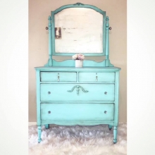"This is a perfectly, imperfect, solid wood antique dresser with mirror. It has been painted in a custom mix of General Finishes Patina Green and Snow White Milk Paint and has been sealed in clear and dark waxes." - The Shabby Shack