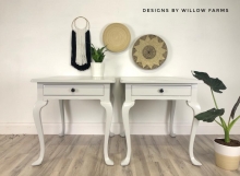 "These Thomasville end tables have been painted with a custom mix of General Finishes Snow White and Seagull Gray milk paint. Sealed with a HPTC in Satin." - Designs by Willow Farms