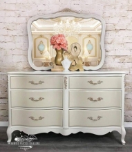 "Finished in General Finishes Antique White and Linen, this bedroom centerpiece has timeless yet refined look. Expertly crafted, this 1950’s Bassett French Provincial dresser and matching mirror has been built to last. Adorned with graceful curves,...
