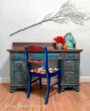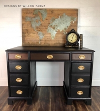 "This poor old desk needed a lot of tender, loving care to get her back to beautiful again!! Painted in General Finishes Lamp Black Milk Paint and stained with Java Gel. The top has a little hint of brown with GF Van Dyke Brown Glaze. Sealed with...