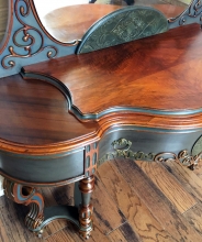This beautiful vanity was lightly sanded with 180 then 220 grit sandpaper. The beautiful burl wood top was then stained with GF dye stain in Amber.
