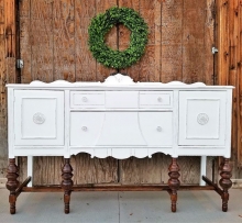 "She was stripped down of all her chipping veneer and given some new molding and accent pieces and then painted in General Finishes Snow White which is a bright clean white.