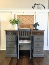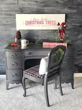 "This beautiful desk or vanity has been all decked out! Finished in General Finishes Queenstown Gray, a nice deep gray and highlighted with distressing and ebony glaze. How rich and ready for the season she is!" - New Old Finds