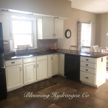 "This is a recent kitchen makeover we recently finished. Painted with General Finishes Antique White and glazed details with Linen milk paint. Then top coated with High Performance. We added new knobs to help update the kitchen and give it a modern...