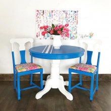 "I can finally reveal this very special project. I was contacted by Wagner Spray Tech to complete a table and chair set for their spring trade show. They chose General Finishes Klein Blue and Snow White (Milk Paint) to complete the project. I mixed...