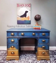"I'm seriously obsessed with this desk. I can't remember the last time I loved something so much! Painted in Fusion Mineral Paint Seaside, with Homestead Blue shading, then washed with General Finishes Coastal Blue. She has an upwards General...