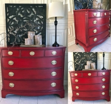 Beautiful antique mahogany chest, with original brass pulls done in General Finishes Holiday Red Milk Paint by Queen City Salvage & Design.