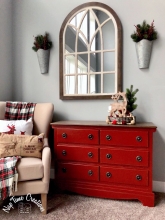 "Sometimes I just need to paint red, and I love it so much every time I do! This all wood dresser was hand painted in General Finishes Brick Red and lightly distressed for that perfect farmhouse look. The top was stained in a beautiful walnut color...