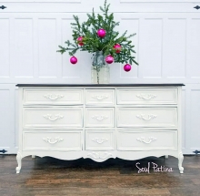"This beauty is headed to a cute little almost 3 year old that also happens to be an almost big sister! Baby arrives any day, so she gets a new room and dresser ❤❤ Painted in General Finishes Chalk Style Paint in Bone White and the top stained in...