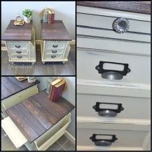 "The transformation on this pair was amazing! I would use this awesome vintage style card catalogue pulls on all the things if I could!! These have new plank tops added and stained in General Finishes Water Based Stain in Espresso with Linen Milk...