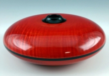 This piece consists of curly maple with an african blackwood trim ring and ebony lip. It was dyed with a mixture of red and yellow dye. It was finished with General Finishes Wood Turners Finish.It measures 8-1/4" diameter X 3" tall.