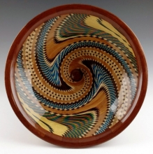 "This piece was made with over 3,000 pieces of wood that includes cherry, maple, peruvian walnut, yellowheart, spectra ply and black veneer. It measures 12-1/2" diameter X 6-1/4" tall. The finish consists of several coats of sanding sealer and...
