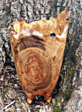 This is a Maple Burl vessel with carved feet. People that have seen this piece have said they see a face on the one side of the vessel.