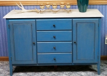 "We are building a dining table that will go alongside this beautiful buffet that has just been updated in General Finishes Coastal Blue and six of these chairs that have been painted in General Finishes Snow white and distressed. I love the pattern...