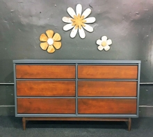 "Just finished up this awesome mid century dresser. The body was finished with General Finishes Queenstown Gray and Flat Topcoat. The drawers were sanded down and stained with their Antique Walnut Gel Stain and sealed with the Satin Topcoat." - The...