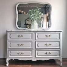Timeless set in General Finishes Seagull Gray Milk Paint by Katie & Co. Furniture Restorations.