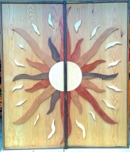 "Wanted to share a picture of this set of double doors. They are about 7 ft. tall by 6ft. wide, and feature mahogany, walnut, cherry, maple, and white oak. No dyes or stains used in this piece! It was GF Exterior 450 Topcoat only. These are actually...
