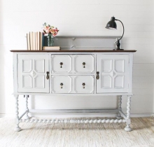 "I refinished this English Buffet in General Finishes "Seagull Gray" with an Antique Walnut Top. The original piece was very dark and very heavy, but this is a solid, quality piece that just needed some freshening up! The details on this piece are...
