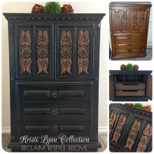 "This beautiful ornate armoire is restyled and ready for my client. Painted in General Finishes Lamp Black Milk Paint and sealed in High Performance Topcoat Satin. I kept the gorgeous wood color of the ornate doors, cubbies, and hidden drawers....