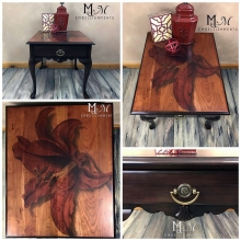 "Red stained lily table. General Finishes Merlot Dye. Also used Ebony Dye as a wash on the existing finish on the base of the table for a richer look." - M&M Embellishments