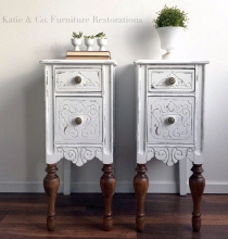 Once a vanity, now 2 gorgeous bedside tables painted in GF Snow White Milk Paint with natural oiled legs.