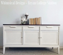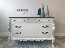 "Recent custom ornate dresser painted in General Finishes Antique White Milk Paint. Top completely sanded down and stained in GF Antique Walnut Gel Stain. Beautiful carvings enhanced with black wax and original hardware updated to a more modern...